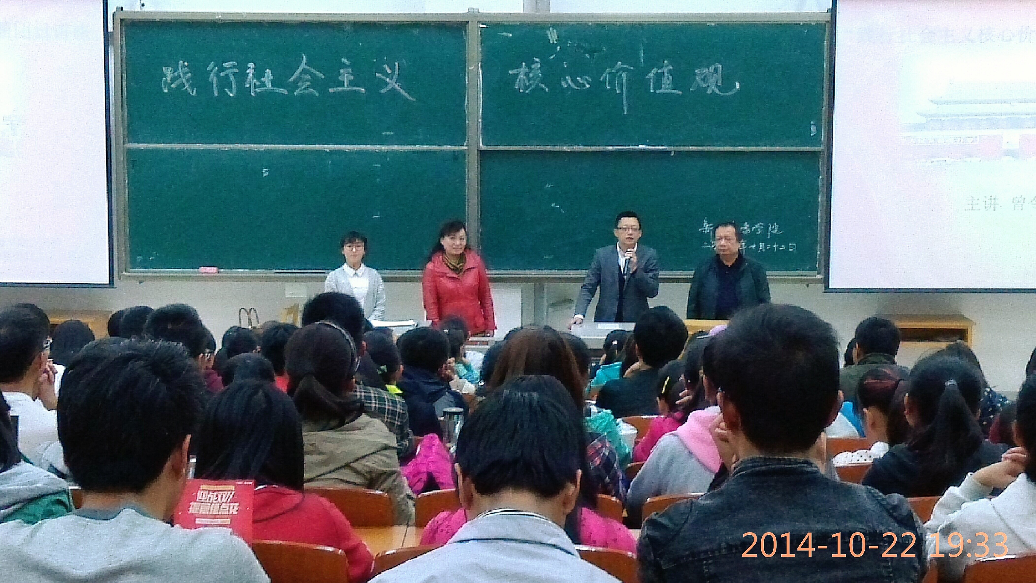 2014年10月22日晚,bevictor伟德举办了“践行社会主义核心价值观”主题团日专题讲座。本次讲座邀请了社会管理公司曾令琼教授担任主讲,新闻传播公司党总支书记师克谦、副经理刘锐,分团委书记吴文娟,bevictor伟德员工会干部及2014级新生参加了本次讲座。
