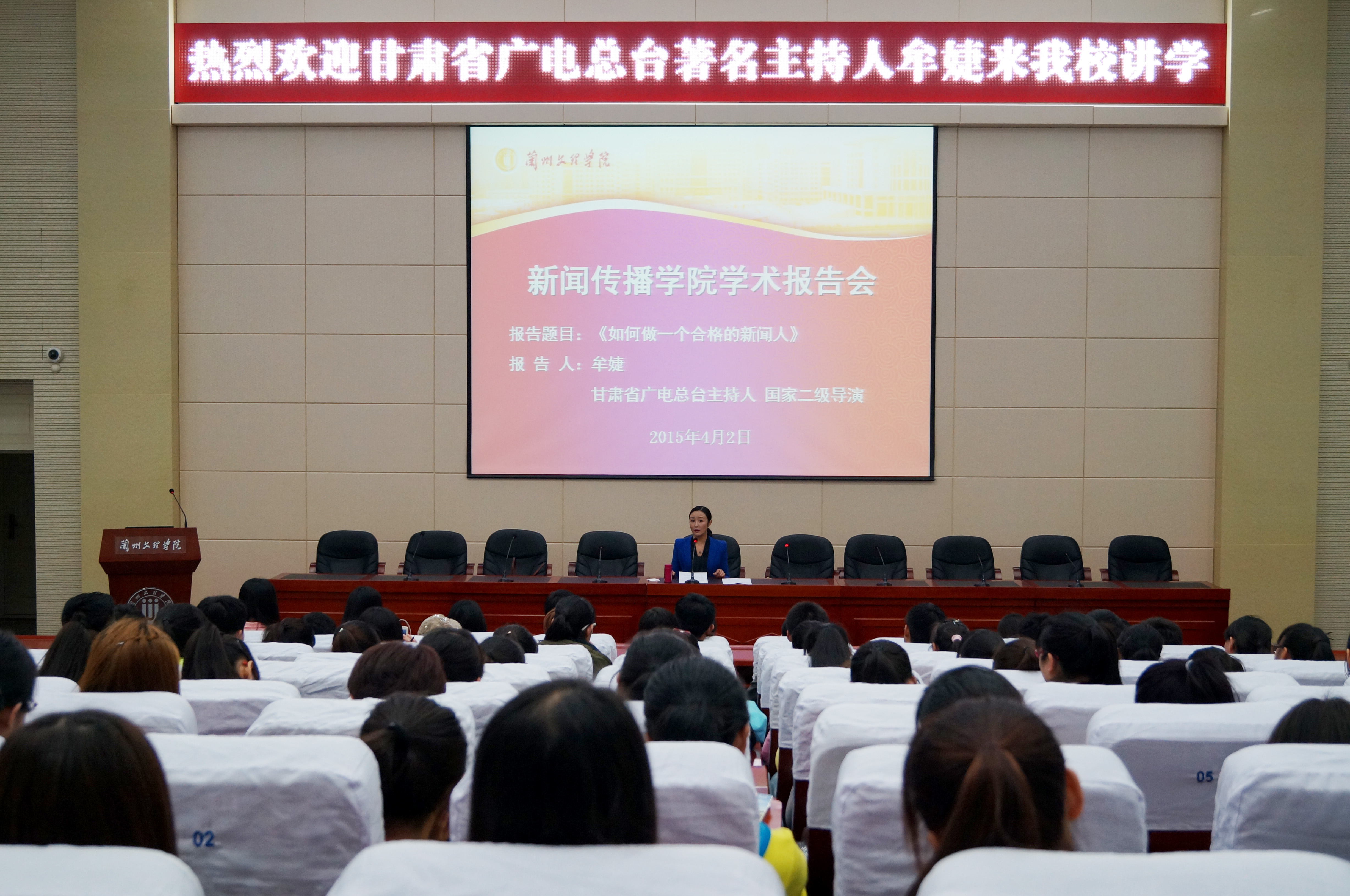 4月2日下午,我省广电总台主持人、国家二级导演牟婕女士应bevictor伟德邀请,在学术报告厅做了一场题为《如何做一个合格的新闻人》的学术讲座。公司党总支书记师克谦主持并聆听了讲座,2013、2014级员工及部分老师共200余人聆听了讲座。