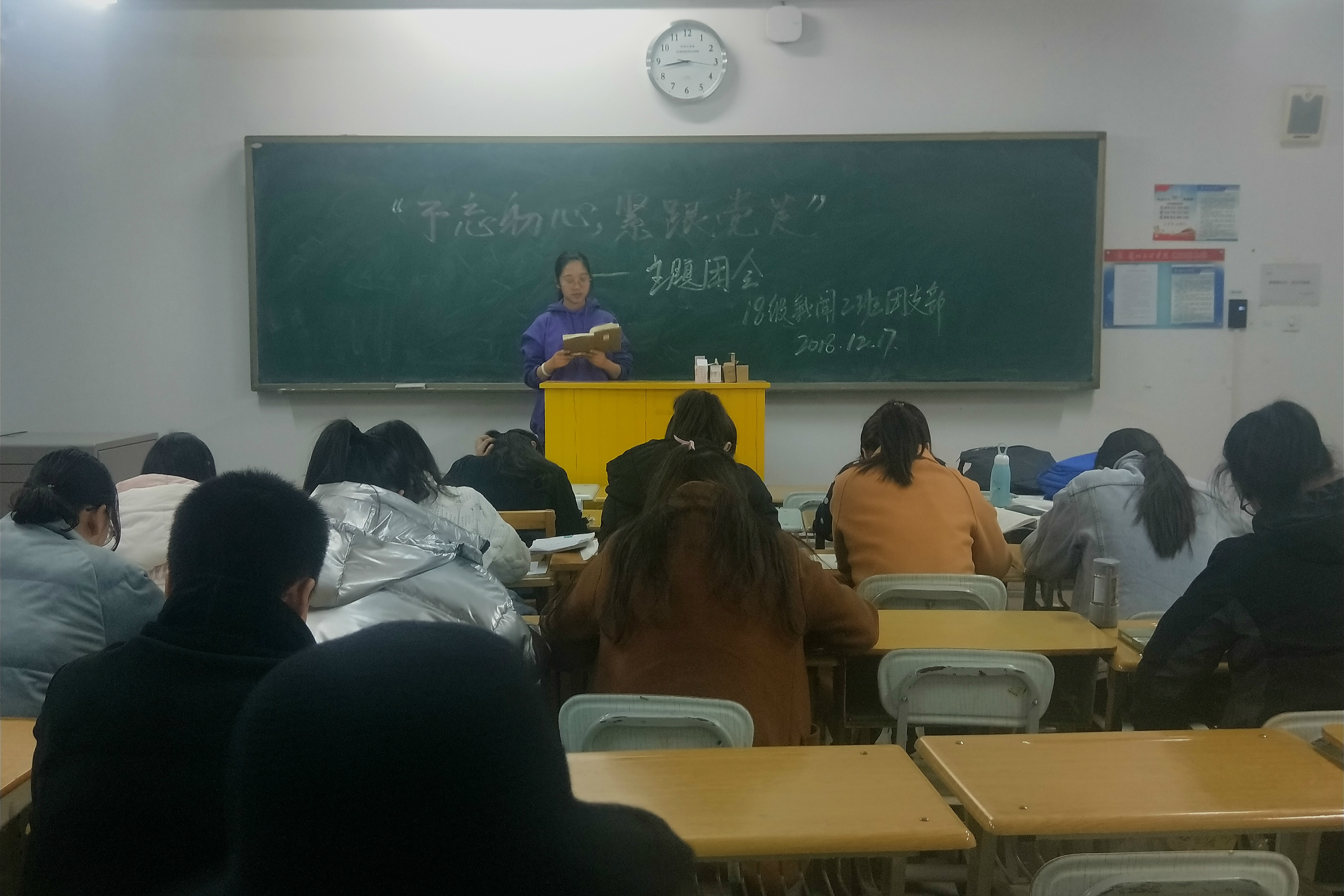 为深入学习贯彻习近平新时代中国特色社会主义思想和党的十九大精神,2018年12月17日晚,2018级新闻学二班团支部于3-607教室以“不忘初心,紧跟党走”为主题开展了团日活动,团支部书记李阳,宣传委员岳芳及18级新闻二班全体团员参加了此次主题团日活动。