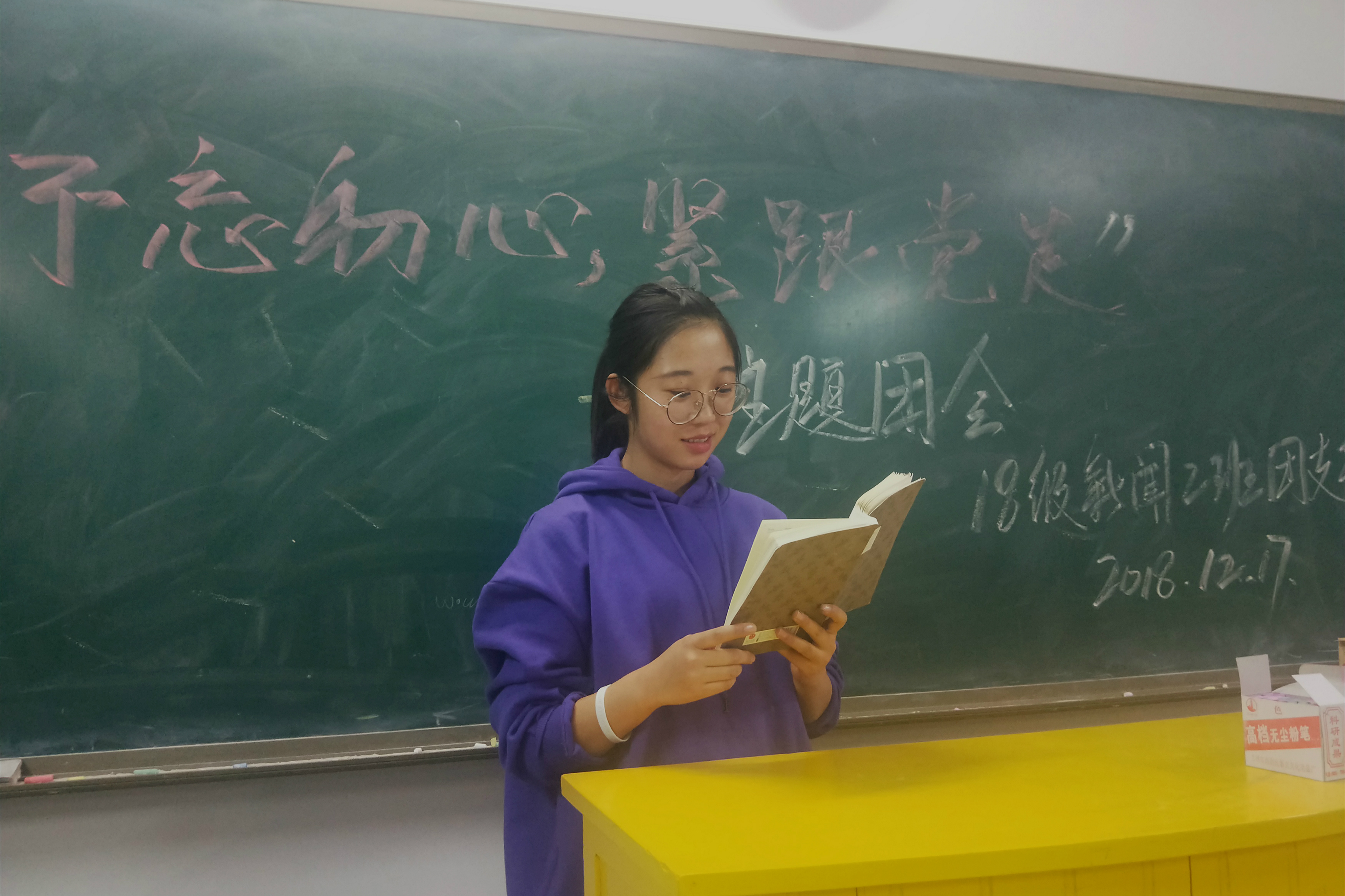 为深入学习贯彻习近平新时代中国特色社会主义思想和党的十九大精神,2018年12月17日晚,2018级新闻学二班团支部于3-607教室以“不忘初心,紧跟党走”为主题开展了团日活动,团支部书记李阳,宣传委员岳芳及18级新闻二班全体团员参加了此次主题团日活动。