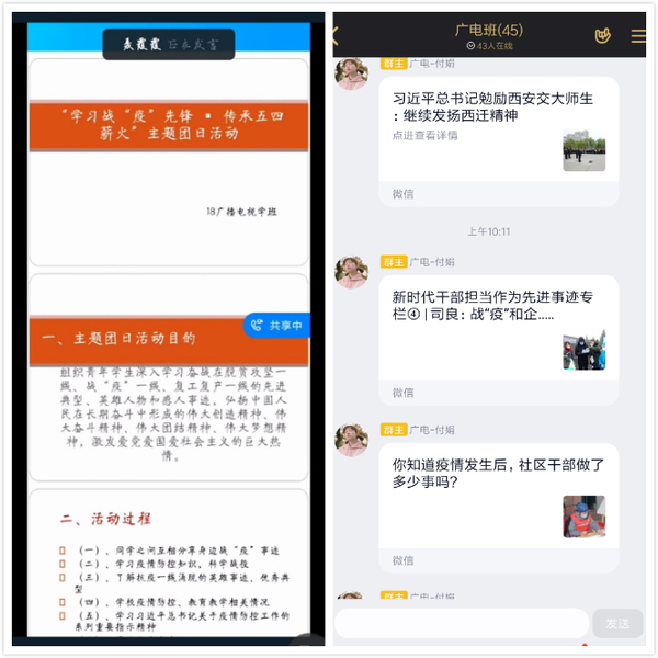 2017级广播电视学班团支部、2018级新闻学一班团支部、2018级数字出版班团支部、2019级播音与主持艺术班团支部组织团员青年深入学习奋战在脱贫攻坚一线、战“疫”一线、复工复产一线的先进典型、英雄人物和感人事迹,推动青年团员接受精神洗礼,进一步激励青年学子传承五四精神,号召大家把对先进典型的敬仰和感动转化为勤学上进、干事创业的实际行动。2017级广播电视学班团支部还组织团员青年向身边的战“疫”先锋牟晶同学学习,支部书记付娟同学向团员青年介绍了牟晶同学在志愿服务中结合专业知识助力地方疫情防控的先进事迹,同时号召大家要学以致用,在志愿服务中充分展示新闻学子良好的精神风貌。
