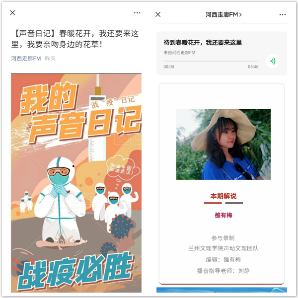 2018级播音与主持艺术一班团支部、2018级播音与主持艺术二班团支部在专业教师的指导下组织团员青年积极参与中国甘肃网《声音日记》录制工作,通过团员青年们的讲述,使得广大听众身临其境、感同身受,真正用声音讲述人间大爱。与此同时,其他班级团支部也分别开展了丰富多彩的主题团日活动。