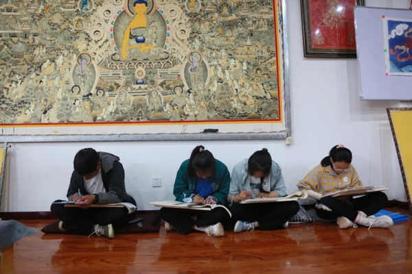 在丹增画师的带领下,实践团成员一一参观了他的工作室墙壁上所挂的唐卡作品,并与正在学习唐卡绘画的学员们进行了交流。