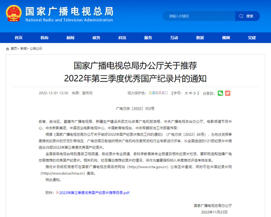 为充分发挥季度推优纪录片的示范引导效应,国家广电总局日前组织相关广电机构负责同志和行业专家进行评审,从全国选送的121部纪录片中推选出36部第三季度优秀国产纪录片。根据《国家广播电视总局办公厅关于做好2022年国产纪录片推优工作的通知》(广电办发〔2022〕46号),全国各级电视台特别是各卫视频道、各纪录片专业频道、各科学教育类专业频道及相关纪录片栏目,要积极选购选播广电总局推荐的优秀国产纪录片。相关机构、栏目播出推荐纪录片的情况,将作为重要指标纳入年度推优评选考核体系。