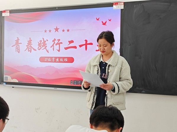 为深入学习贯彻党的二十大精神,进一步加强开学初员工思想政治教育,落实公司相关要求, 2023年3月16日下午,2021级数字出版班开展以“开学第一课”为重点、以“青春践行二十大”为主题的2023年春季学期主题教育活动,活动由副班长王伟真主持,2021级数字出版班全体同学和班主任甘雯老师参加本次活动。