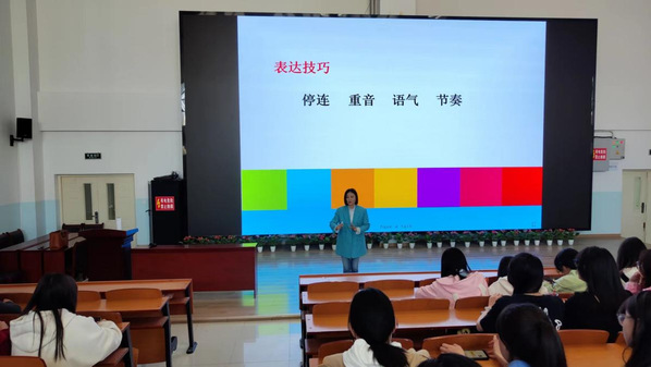 讲座就如何正确发音,改善音色,如何用语言讲好故事为主要内容进行阐述,让同学们快速掌握了学习语言表达的技巧。刘静老师说:“播音主持创作中的语言表达是有技巧的,表达的状貌特征与动作神态非常重要,你有什么样的精神状态就会有什么样的语言表达,状态来源于精神,一切都是精神的创造与给予。”