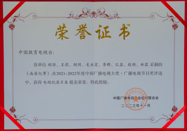 《南梁纪事》获中国广播电视大奖纪录片提名奖