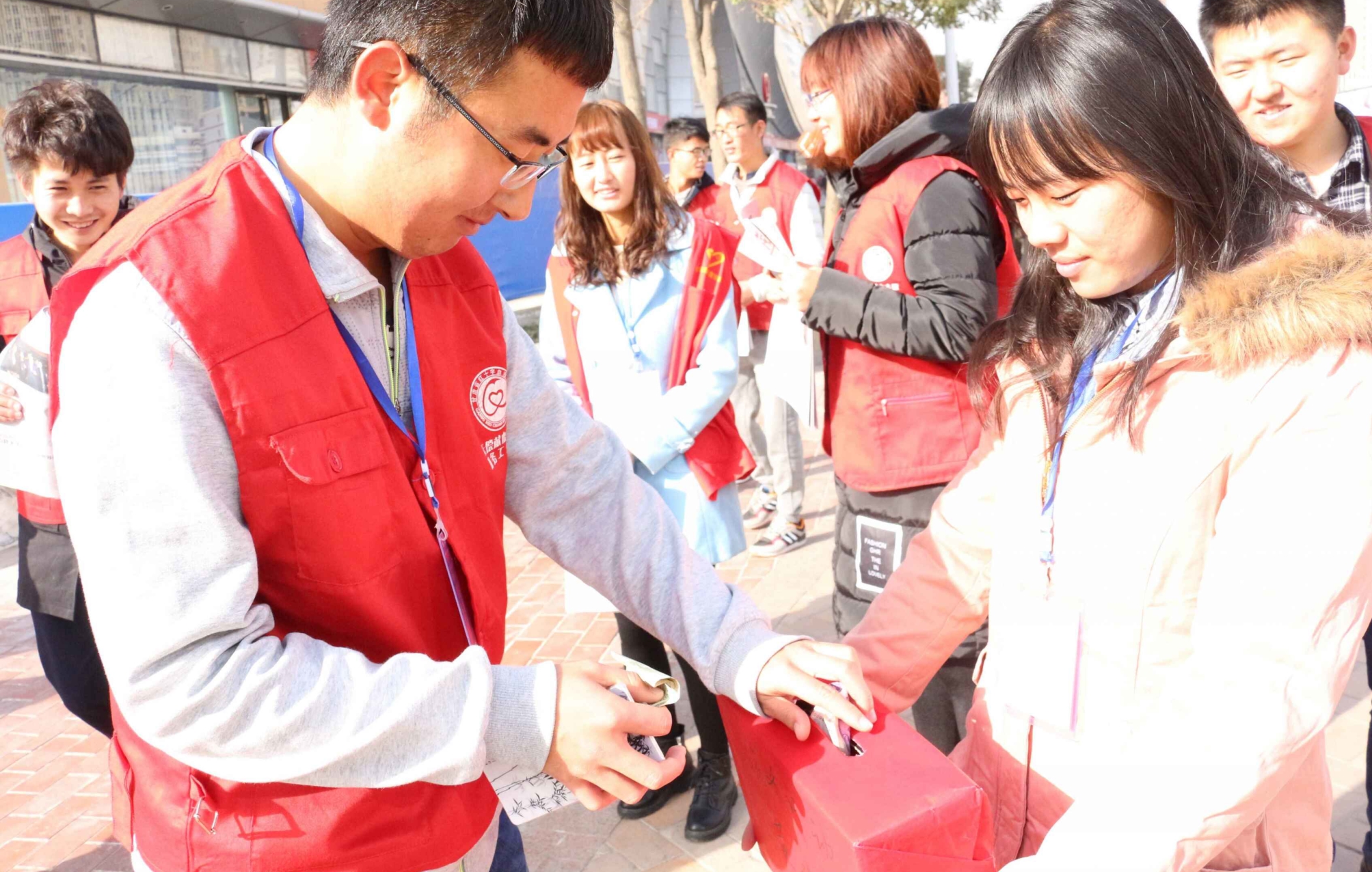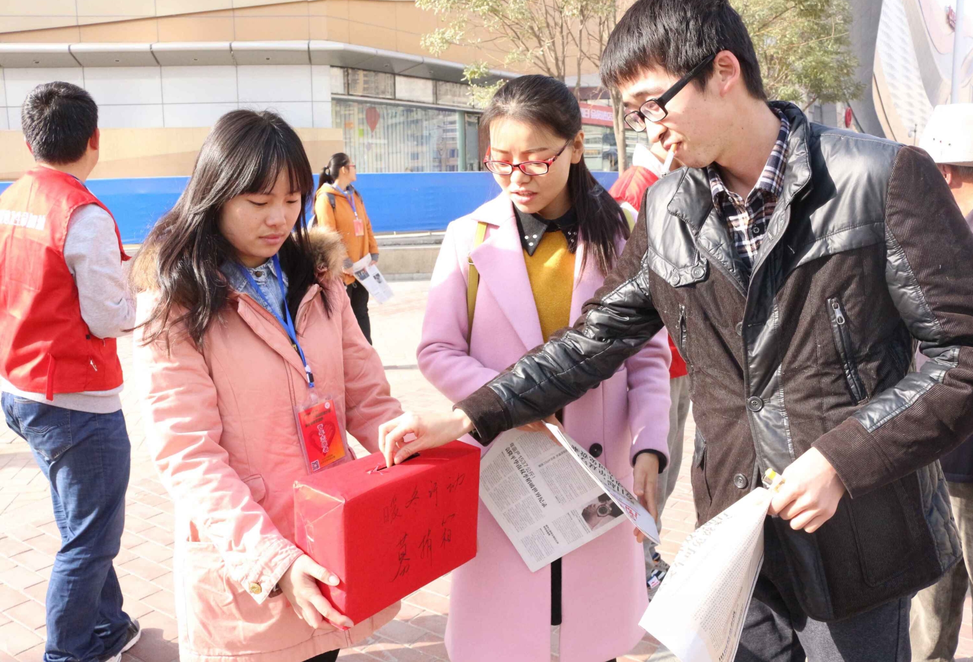 穿着红马甲的志愿者们走在街头,形成了一道亮丽的风景线,向路人介绍本次活动开展的意义,尽力说服他们买下一份报纸,奉献爱心。尽管在这一过程中志愿者遭受了路人嫌弃的眼神,怀疑的目光,甚至是广场保安的驱赶,但是志愿者并们没有气馁,没有放弃。志愿者们面带真诚的笑容,更加耐心的向路人介绍我们的活动,终于有人愿意停下脚步,听志愿者们讲完,接过志愿者手中的报纸将爱心款投入捐款箱,也有一些爱心人士没有拿走报纸只留下爱心款就匆匆离开。