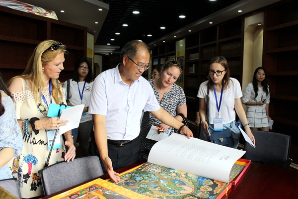 甘肃国际交流研习班成员一行首先来到公司敦煌文献资源中心,图书馆馆长王金寿对中心的用途及意义作了详细介绍,并展示了宝贵藏书及佛像雕塑等文化资源,研习班成员对所看到的敦煌文献赞不绝口。