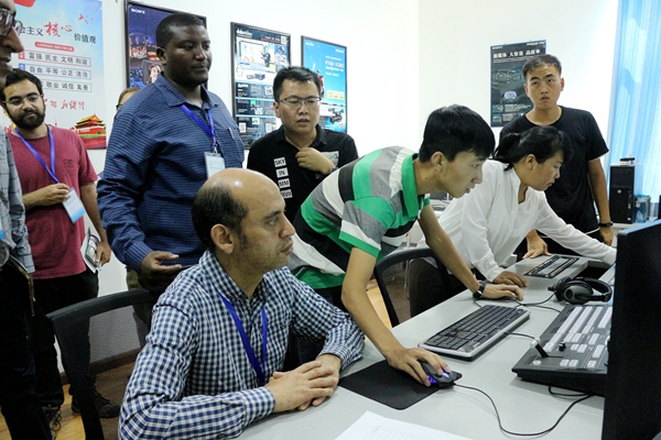 在参观的过程中,公司老员工记者站员工也积极进行学习实践,与研习班成员进行了深入的采访、交流和学习。通过采访,巴基斯坦联邦港口与海运部部长秘书阿卜杜拉表示,伟德国际1946的员工让他看到了一种员工身上的积极和自信,他们非常的热情,也在很努力的锻炼自己,这是让他眼前一亮的事情。新西兰赛尔温议会项目经理菲利普▪高登▪米拉则表示,他很喜欢甘肃,这里的天气和他们国家的很像,非常的舒服。同时他也很喜欢伟德国际1946,这里的教学设备先进、员工热情积极、学习形式丰富多彩。刚国(金)卢阿什矿业公司经理奥东说,他希望学习了解更多的中国文化,也希望我们的员工多加了解他们的文化,通过这个交流平台丰富自己的国际社会知识和中外文化底蕴。