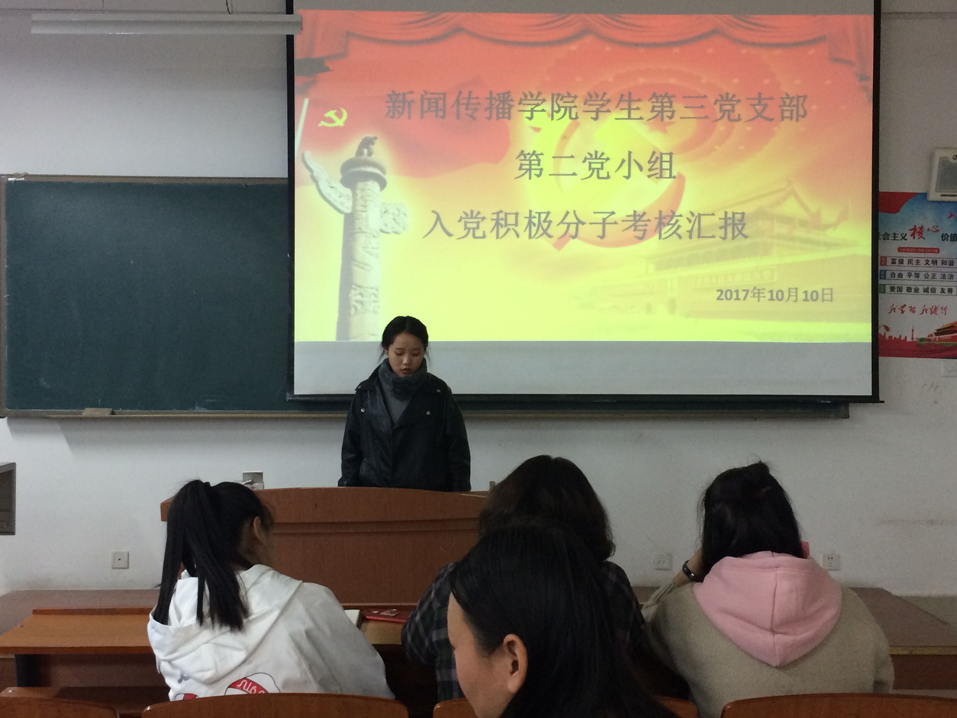 接受考核的入党积极分子对于党的宗旨,性质,党的路线、方针、政策及党员的权利和义务等方面做出了汇报和总结,并表示将继续学习党章。马霞强调:入党积极分子首先要从思想上入党,端正态度,认真学习党章及党的精神并贯彻于学习和生活中,真正做到理解和融入党,用党的思想来规范自己做人做事,努力学习党章党史,早日成为党员,为国家奉献一份力量。