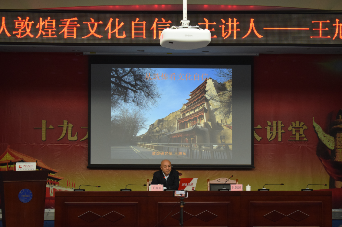 24日为“网络陇原大讲堂”的第三讲。敦煌研究院王旭东经理围绕“从敦煌看文化自信”这一主题为我们作辅导报告。王经理解析了敦煌莫高窟深厚文化的起源――敦煌莫高窟的千年营建与发展,要感恩两条“河流”的滋养:一条是在石窟前流淌的宕泉河,她为莫高窟带来了生机与绿色;另一条是敦煌本土及丝路上往来的民众们,他们世世代代的诚敬供养和不辍营建所汇聚的心灵之河,造就并延续了敦煌文化艺术。另外,王旭东还向大家介绍了敦煌石窟保护的历史与现状,并用一幅幅蕴含着悠久历史与文化底蕴的壁画,展示了敦煌这片神奇净土上的文化艺术宝库。