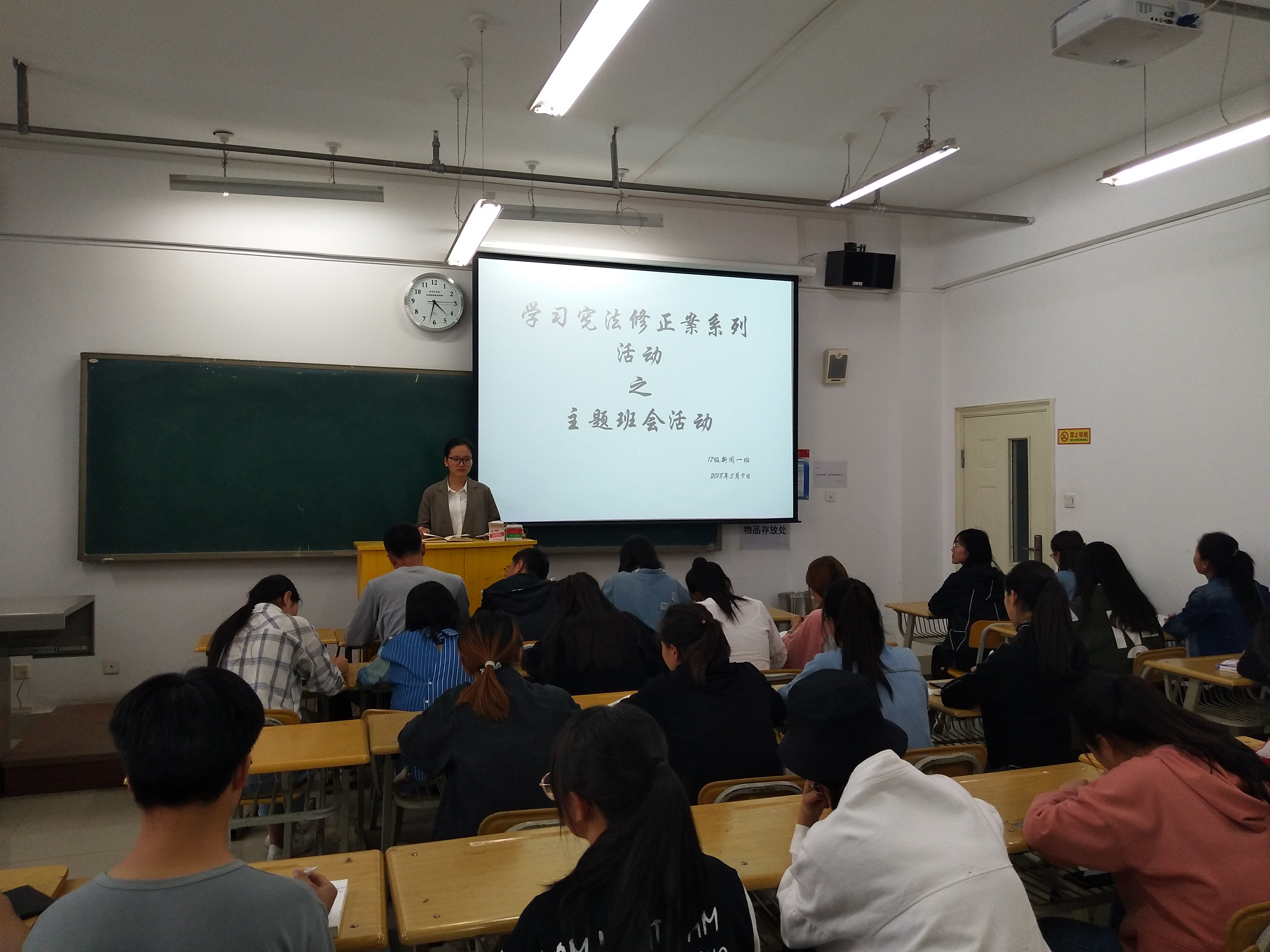 5月9日, 17级新闻一班在3-605教室举办了“学习宪法修正案系列活动”主题班会活动,本次活动由副班长黄真主持,新闻一班全体同学参加了此次班会活动。