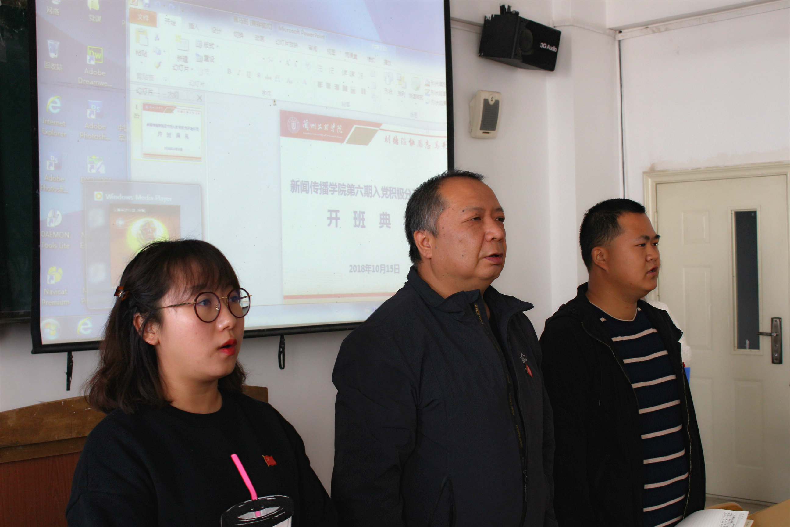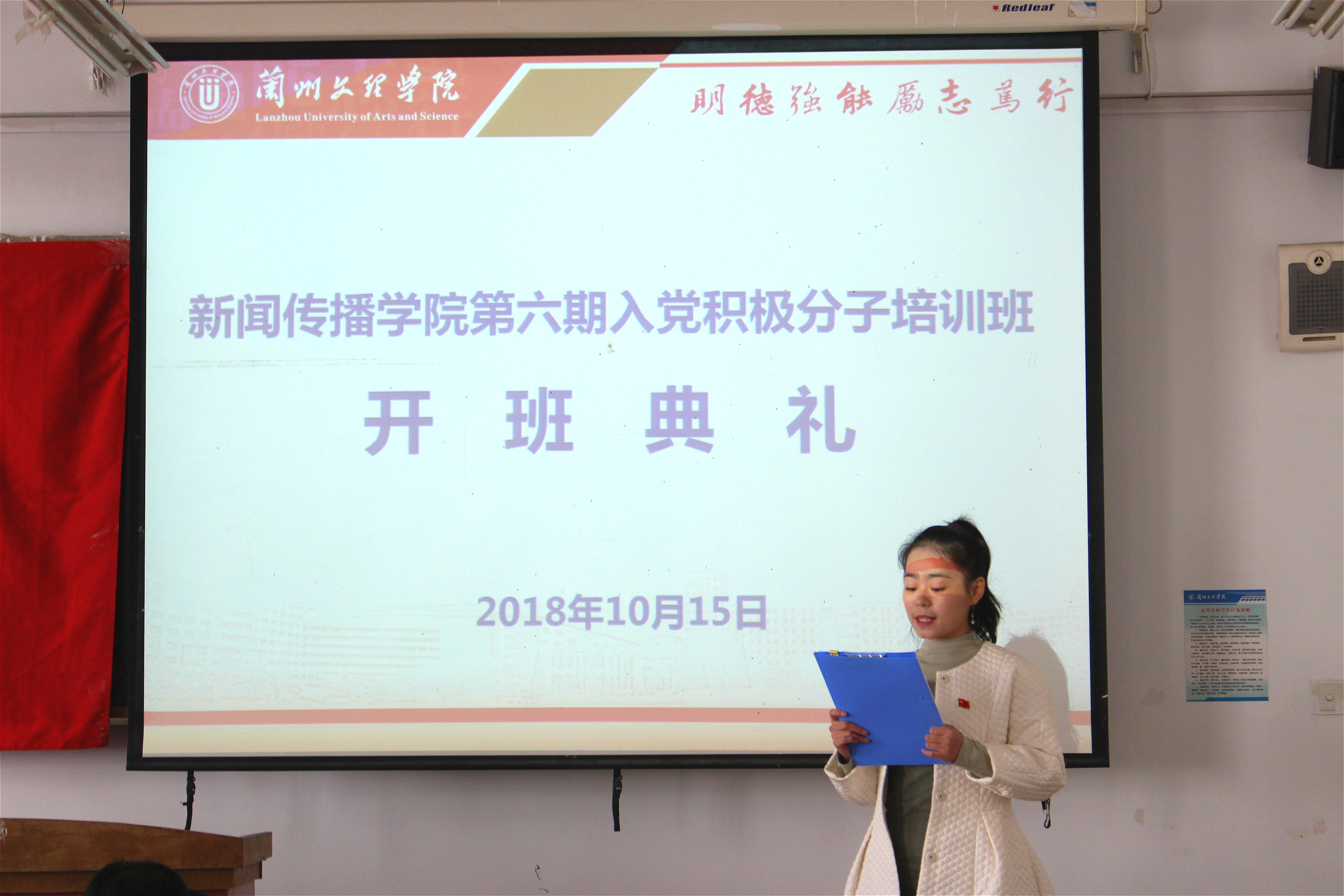 2018年10月15日,新闻传播公司分党校第六期积极分子培训班开班典礼在1-504教室举行,公司党总支副书记、分党校副董事长刘锐出席并讲话,公司党总支青年委员、员工第三党支部书记,员工第一党支部书记及45名入党积极分子参加典礼。辅导员马丽主持典礼。