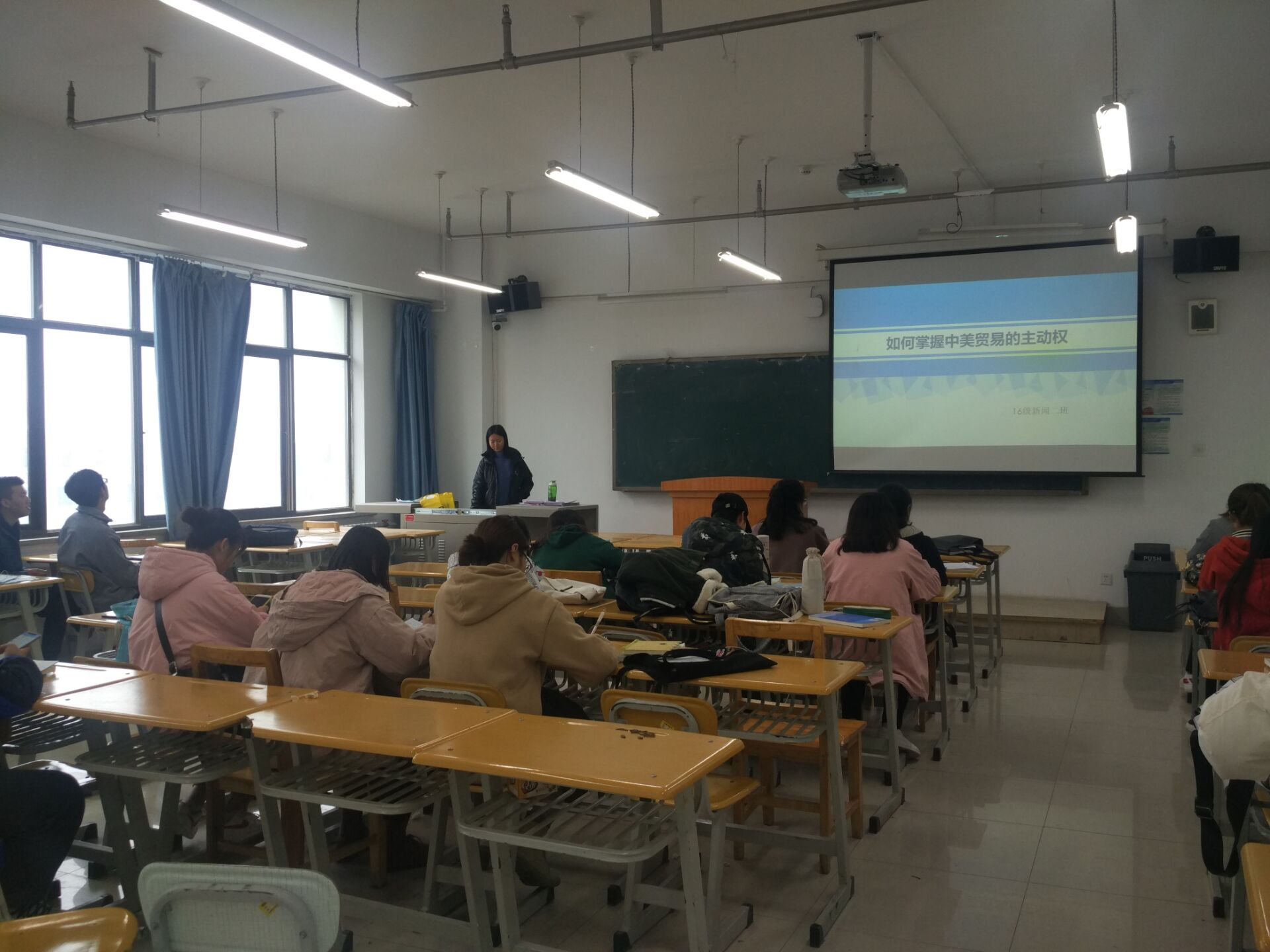 首先,由主讲人展开对中美贸易战的介绍,内容涉及起因,经过,现状,对中国的影响以及美国部分民众的意见。并且详细的阐述了整个中美贸易战的各个方面。之后,主讲人提出了一个问题“如何掌握中美贸易战的主动权”?同学们进行了讨论发言,气氛良好。最后,由主讲人分享一些专业人士对中美贸易战的看法,整个课程进展顺利,同学们反响积极热烈。