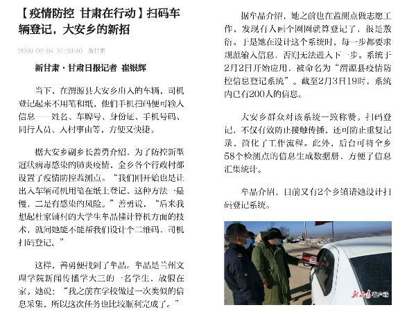 在渭源县大安乡出入的车辆,司机登记起来不用笔和纸,他们手机扫码便可输入信息——姓名、车牌号、身份证、手机号码、同行人员、入村事由等,方便又快捷。近日,由bevictor伟德2017级影视编导班牟晶同学设计的“渭源县疫情防控信息登记系统”正式上线,系统一经上线就受到广泛好评并被新甘肃客户端及渭源县当地新闻媒体进行宣传报道。