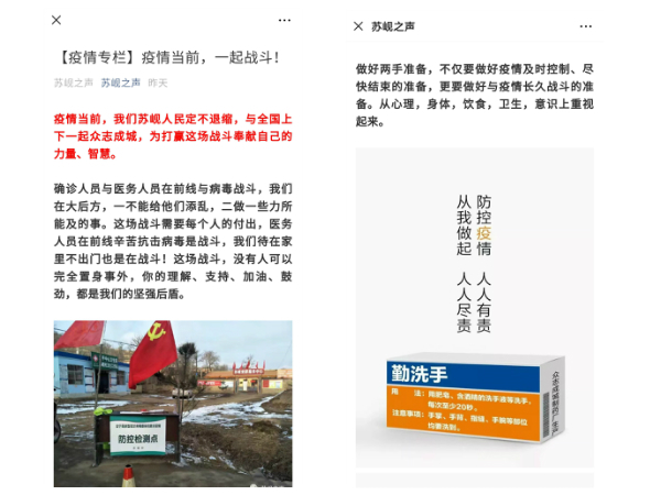看到当前农村疫情防控中群众重视程度与信息获取上的难点,王喜红想到了自己在公司学到的专业知识,创建了微信公众号“苏岘之声”,专门发布苏岘村疫情防控的一线信息与群众中涌现出来的正能量之事。微信公众号也成为了当地疫情防控信息宣传的“主阵营”。她与其他志愿者商量,打算拍摄一部苏岘村疫情防控的宣传片,为疫情防控工作做出自己力所能及的奉献。