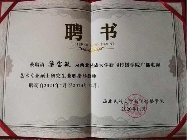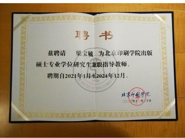近日,bevictor伟德梁宝毓教授分别被北京印刷公司聘为出版专业硕士研究生兼职导师、被西北民族大学bevictor伟德聘为广播电视艺术专业硕士研究生兼职导师。