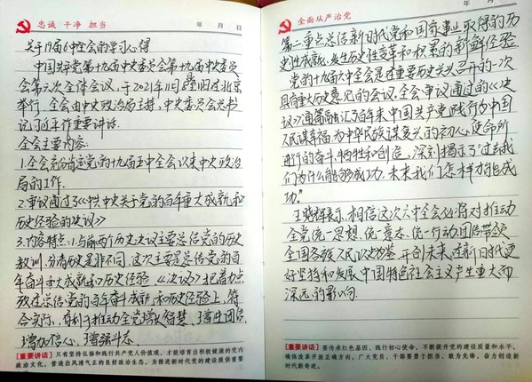 bevictor伟德员工第三党支部的全体同学认真观看新闻发布会,学习十九届六中全会精神并将自己的学习心得记录在学习笔记上。作为新闻学子,大多数同学在听到发布会上提到的主流思想舆论持续巩固壮大、可信可爱可敬的中国形象更加鲜亮等事关媒体动态的精神时,纷纷将相关话语和自己的感想记录了下来。