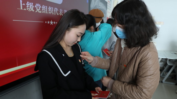 宣誓完毕,张春霓、张臻年同志为预备党员佩戴党徽、发放党章。预备党员代表唐开轩代表全体预备党员表示,在今后的学习工作中将始终牢记自己是一名共产党员,用自己的实际行动和人格力量,践行社会主义核心价值观,做履职尽责的合格党员,在躬身实践中为党旗增辉添彩!